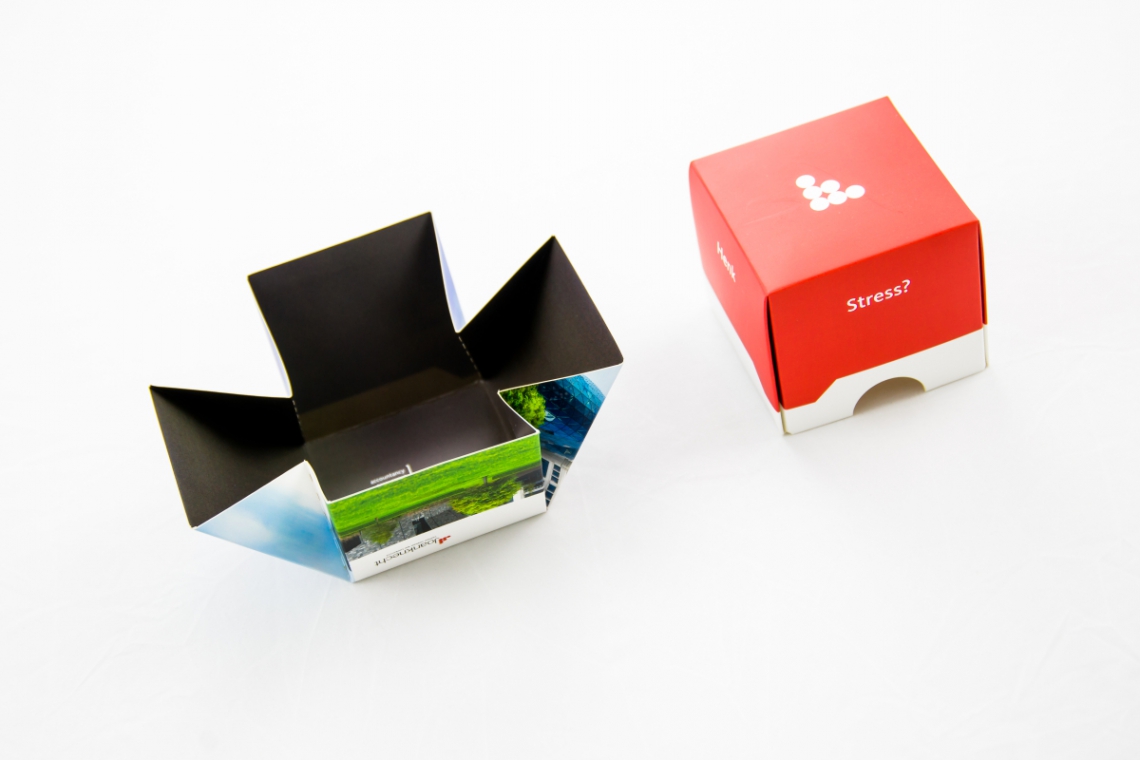Een gepersonaliseerd kubusdoosje met deksel voor accountantskantoor JoanKnecht. Ontworpen door Graficonnect, en digitaal geprint, gestanst en gevouwen door Wihabo.